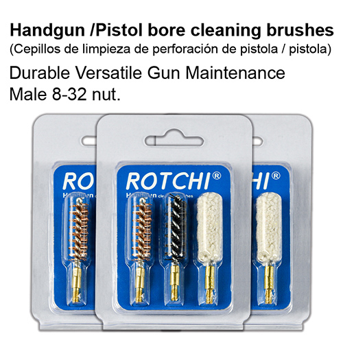 Rengöringsborste för handeldvapen 3-i-1 set, blister och kort paket. Tillgängliga storlekar: .22, 9mm, .40, .45cal.