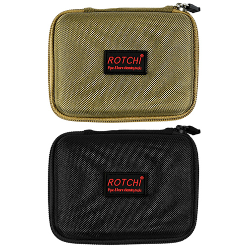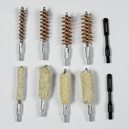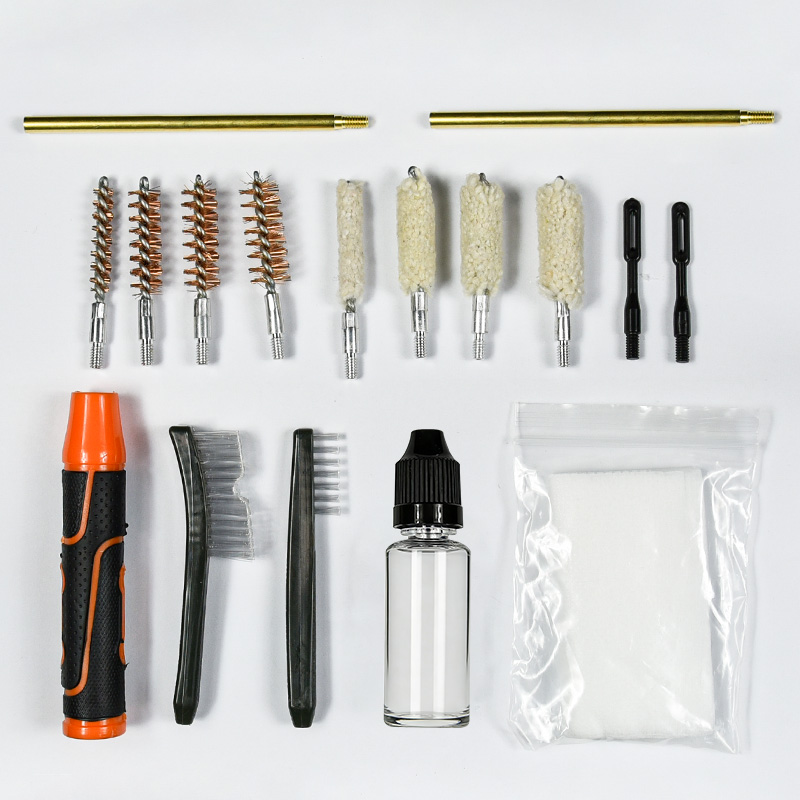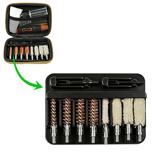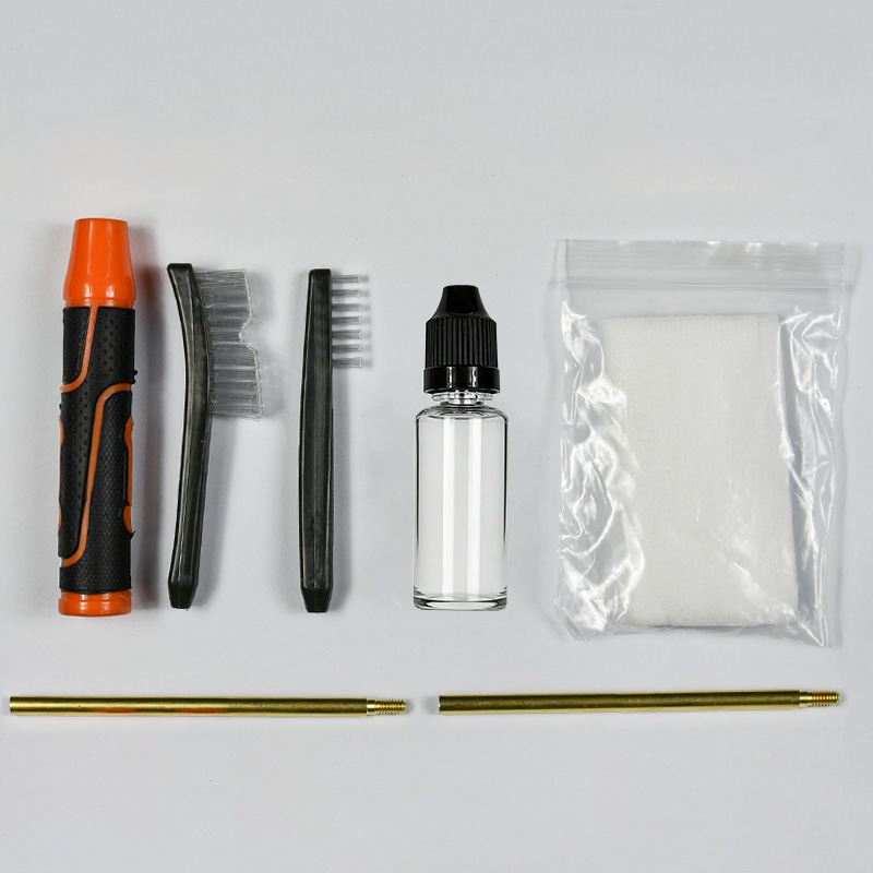 Vapenrengöringssats innehåller 4 storlekar (0,22, 9 mm, 0,40, 0,45 cal.). OX tyg belagd PVC-fodral med dragkedja. Mässingsborstar och bomullsmopper, 2 stavar. Sand och svart färg för val.