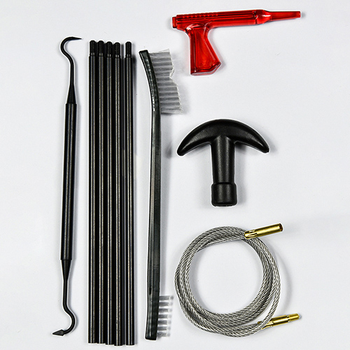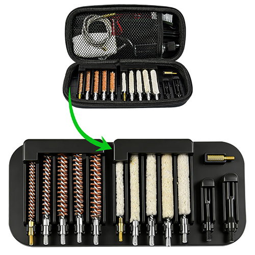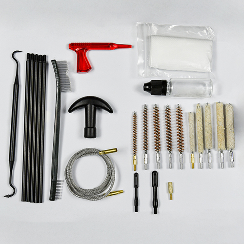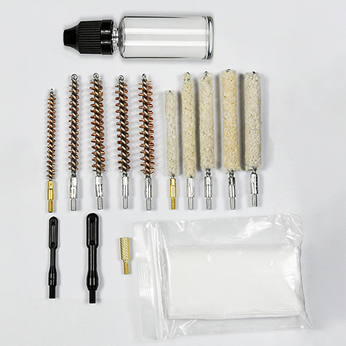 Gevärsrengöringssats innehåller 5 storlekar (.177, .22, .243, .27, .30 cal.), mässingsborstar och bomullsmopper, 5 spön, 2 kalber. Sand och svart färg för val.