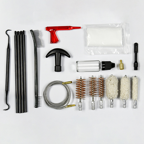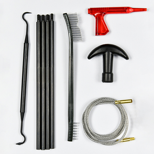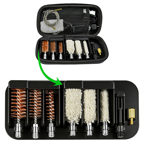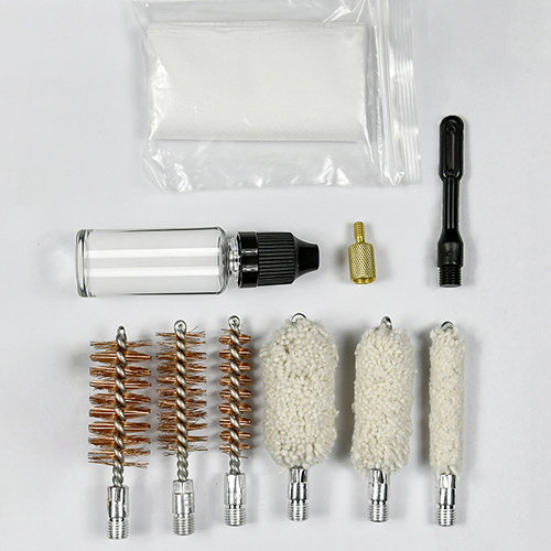 Rengöringssats för hagelgevär innehåller 3 storlekar (12/16G, 20G, 410). Mässingsborstar och bomullsmopper, 4 spön 1 kalbe. Sand och svart färg för val.
