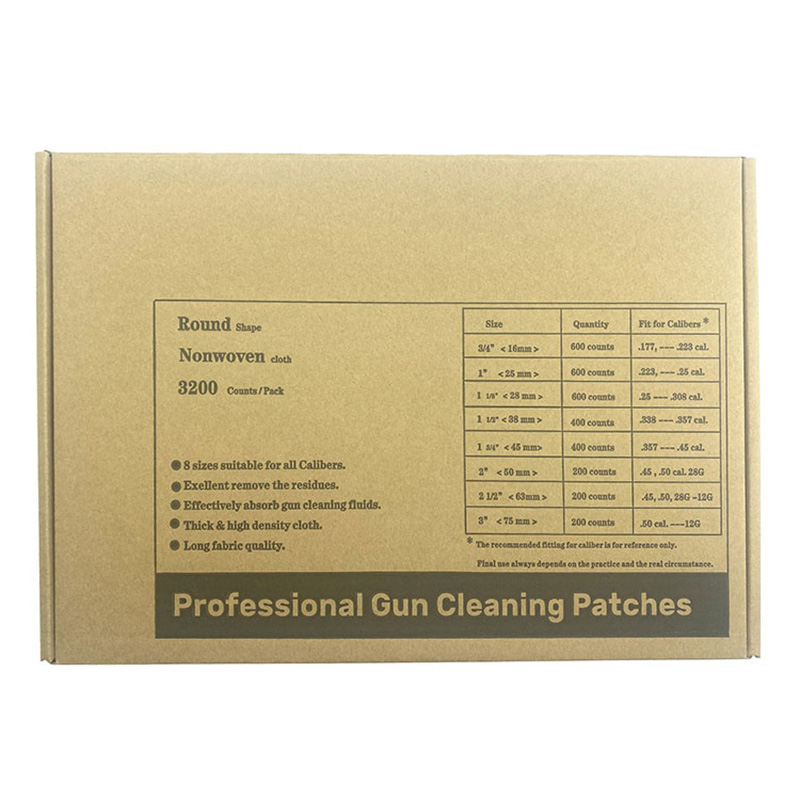 Universal vit bomullsduk, rund pistol rengöringsplåster Blisterkartong 8 storlekar, 3540 räkningar ● 【Allt i ett kombinationspaket】 Rengöringsplåster i 8 storlekar passar alla kalibervapen från 0,177cal. till Shotgun 12G; Spara dina pengar och tid för att köpa olika storlekar för dina skjutvapen av olika kaliber; ● 【Högabsorberande bomullsmaterial】 Denna non-woven duk med hög absorberande. Quick absorberar resten av vätskorna, tar bort rester och rost från borrytan. ● 【Tjockt material】 Tjock non-woven tygyta förstärker den rena prestandan kraftigt. ● 【Varje storlek i en bricka】 Vi packar de 8 storlekarna med 8 brickor. Och varje fack med sin storlek tryckt bredvid facket. Lätt att hitta och ta rätt storlek från förpackningen. ● 【OEM】 Kundlogotypen är acceptabel.